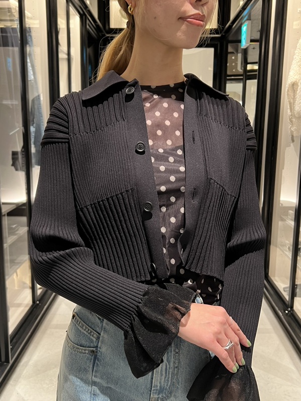 透け感のある糸で編まれた袖口のフレアが軽やかでエレガントな印象を与えてくれます。