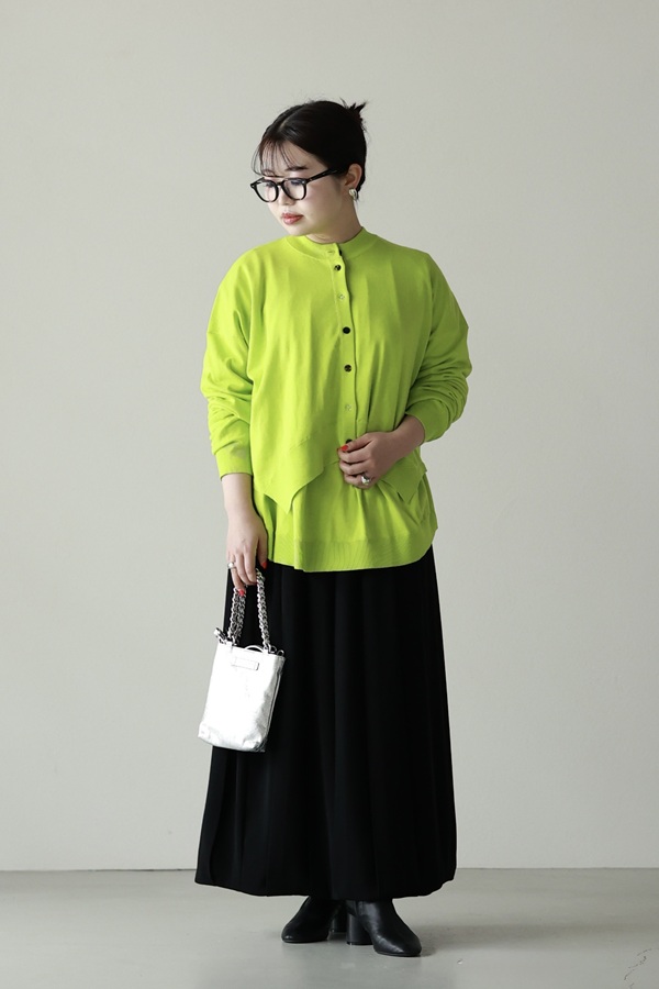 スカートやワンピースと合わせると、落ち着いた雰囲気にまとまります。