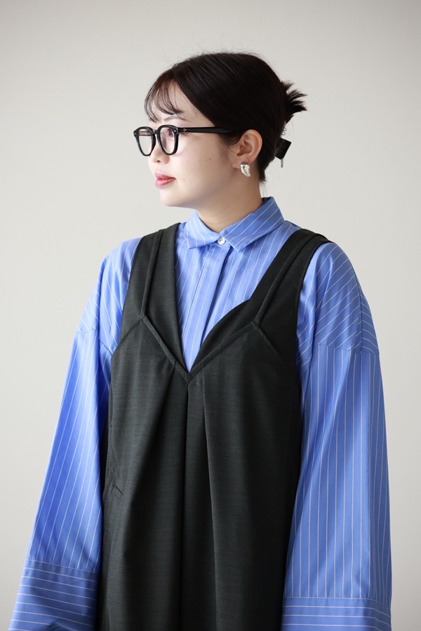 シャツを重ねることで、ジャンパースカートの直線的なラインが引き立ち、
