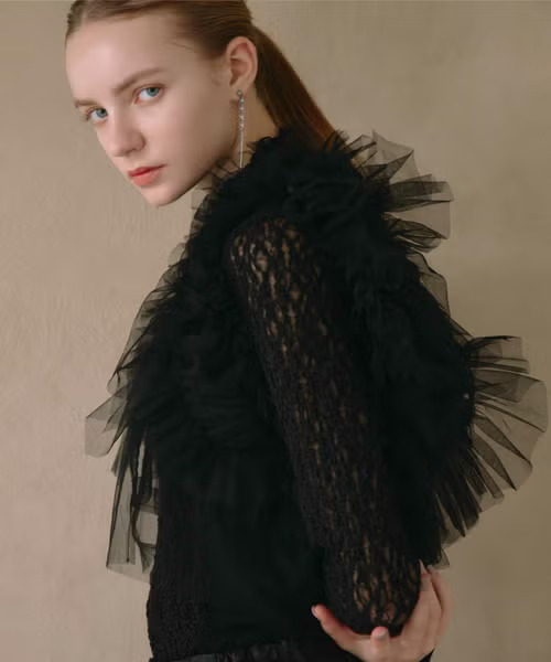 さらに、バストより上のチュールボリュームを抑えることで、肩まわりが大きく見えず、すっきりとしたシルエットに。立体的でありながらも軽やかに身体へ沿うフォルムは、レイヤードした際にももたつかず、洗練された印象を演出します。