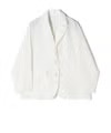 ベージュのオーバージャケットにワイドデニムを合わせた、抜け感のある大人カジュアルに。