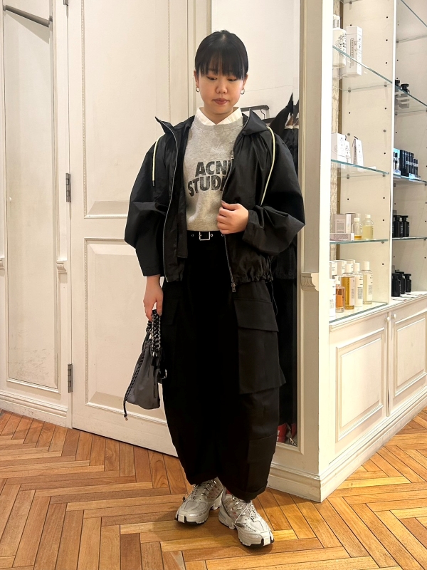 ブラックベースでまとめたモードなスタイリングに、サロモンのスニーカーでスポーティな抜け感をプラス。