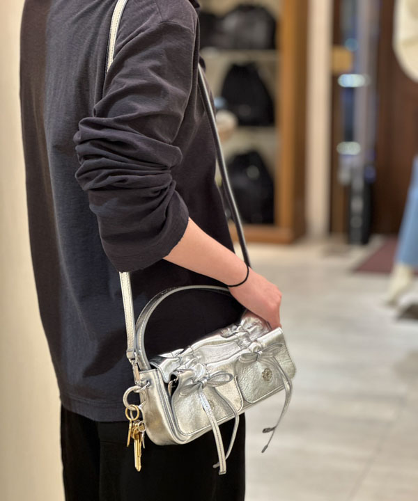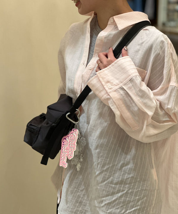 小ぶりなバッグにキーチャームを付けると、遊び心のあるスタイルに。