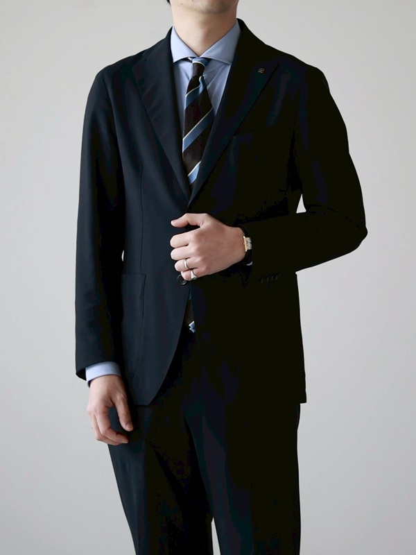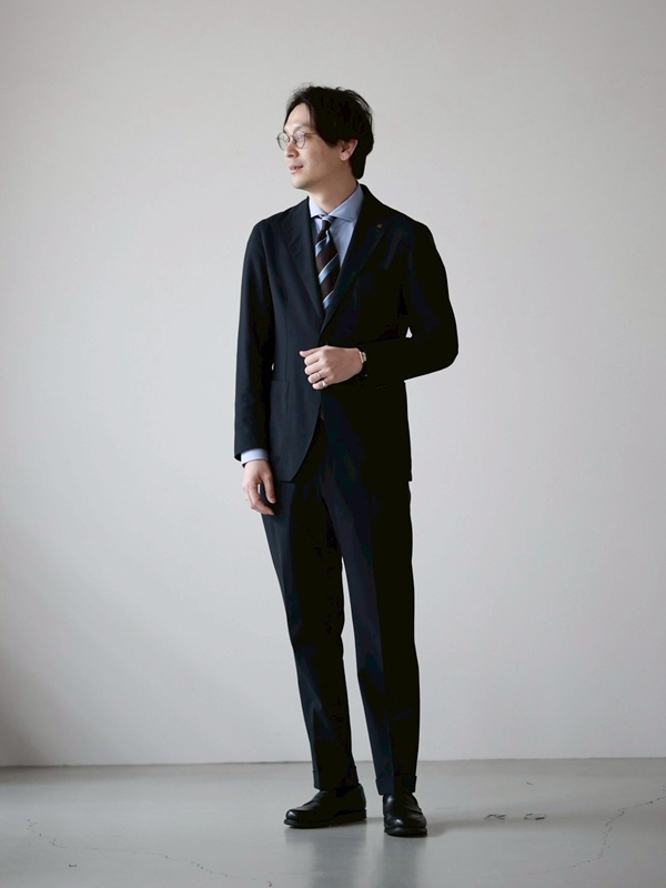 ネイビースーツはビジネスシーンでも最も汎用性の高い定番の一着。