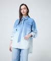 ボトムも同系色でまとめることでグラデーションの美しさがより引き立ち、洗練された統一感のある装いが完成します。シンプルなコーディネートでも主役になる、存在感のあるデニムシャツです。