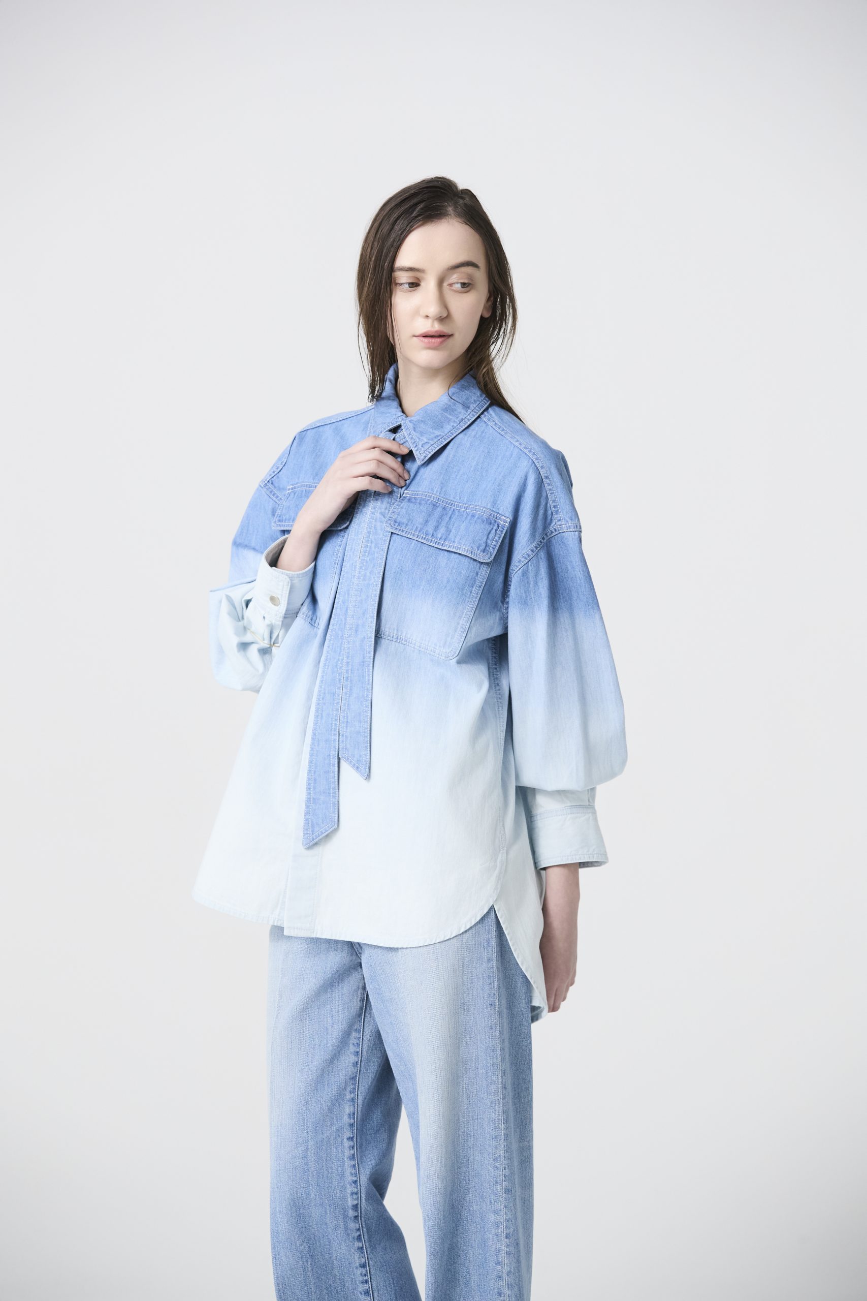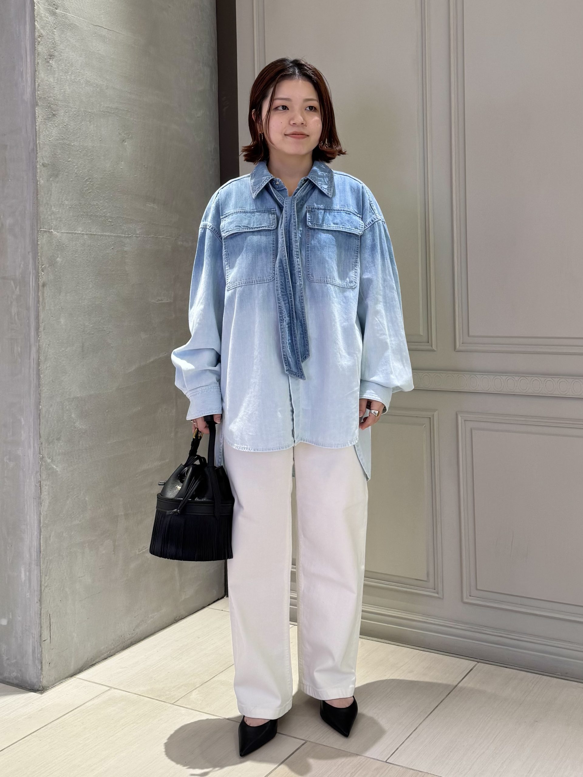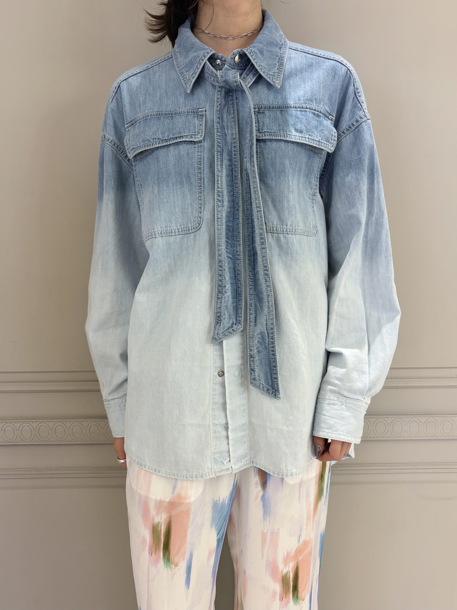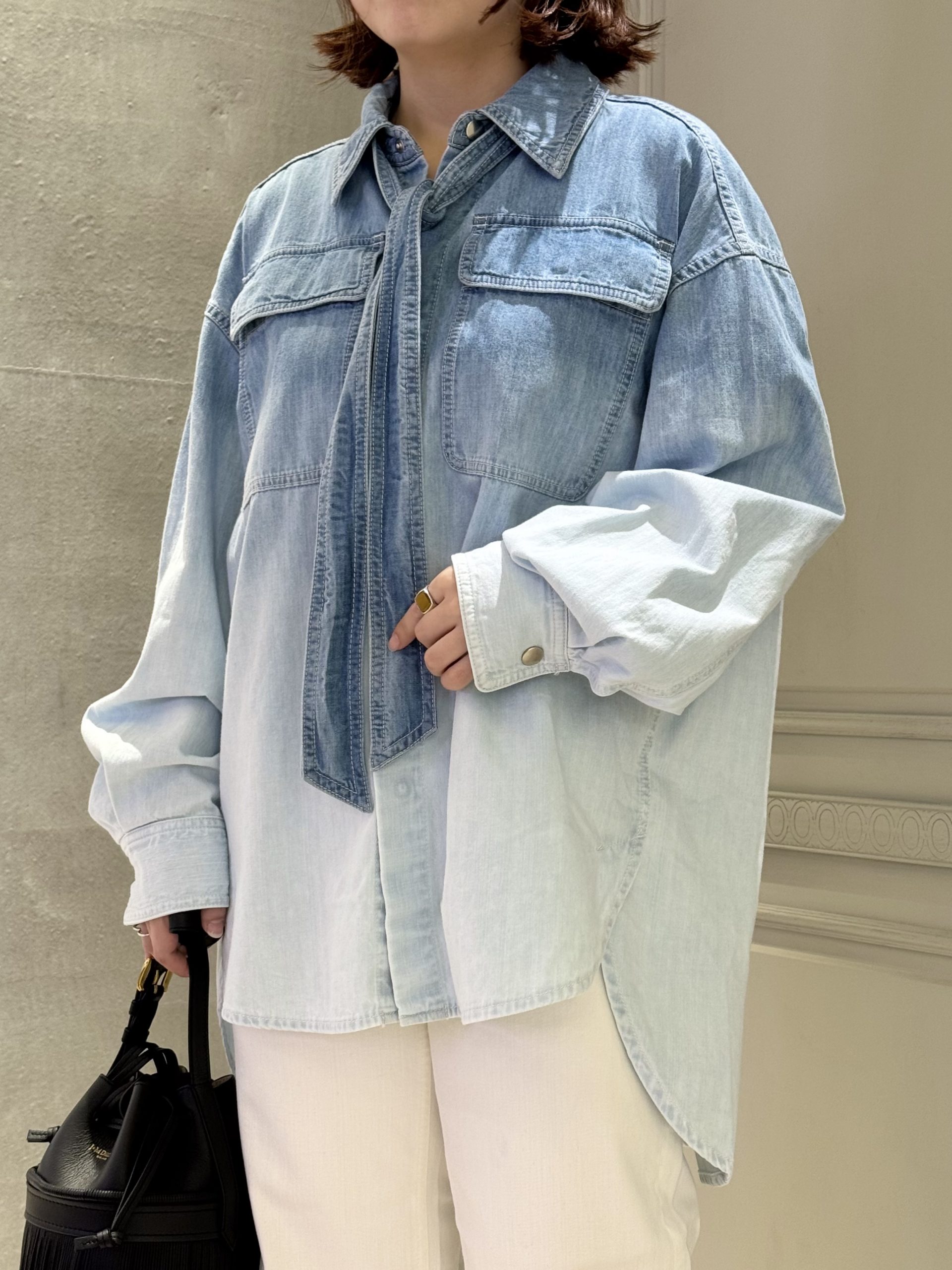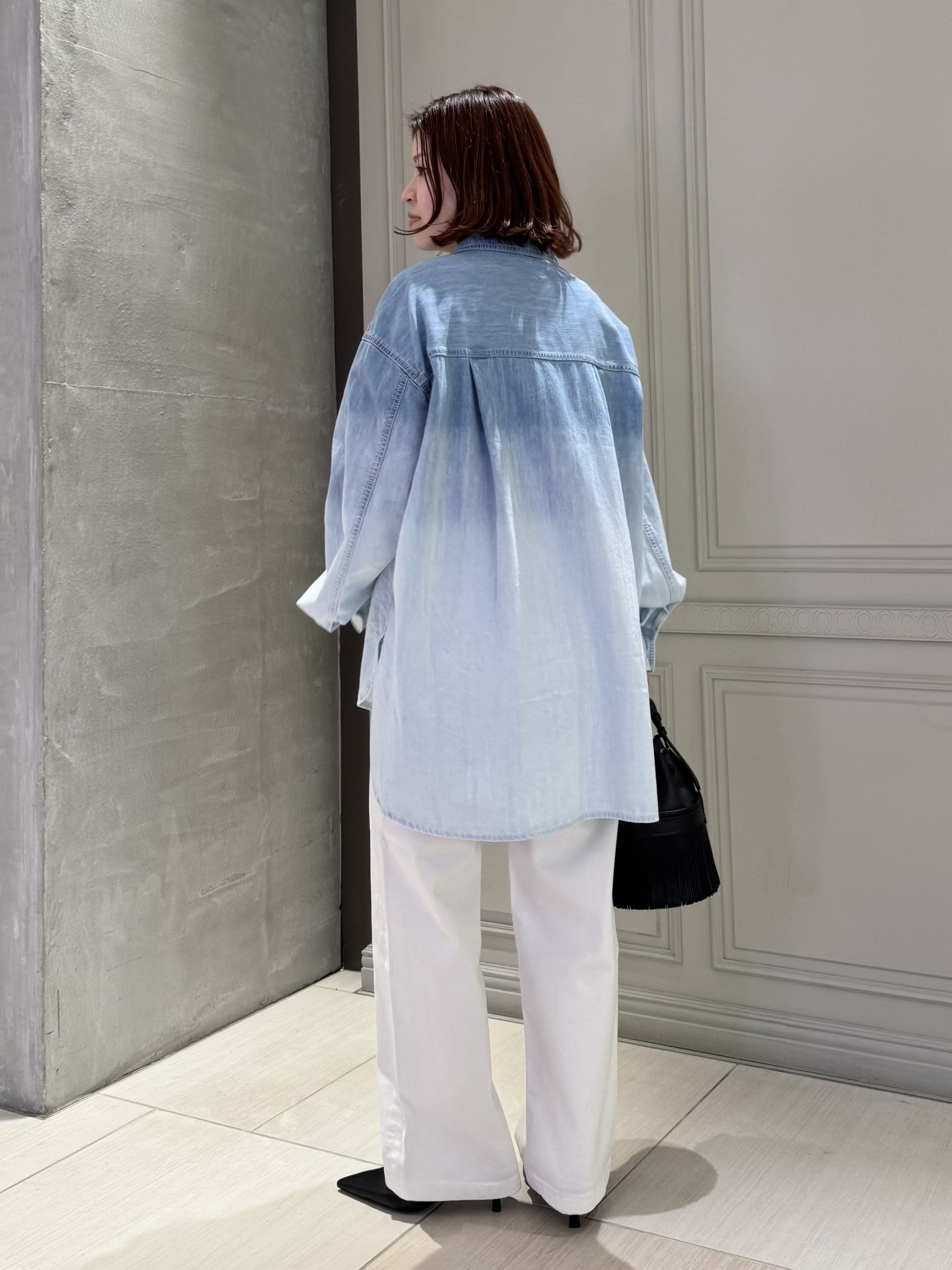 シャツのグラデーションに溶け込むようなホワイトデニムを合わせた、クリーンなスタイリング。