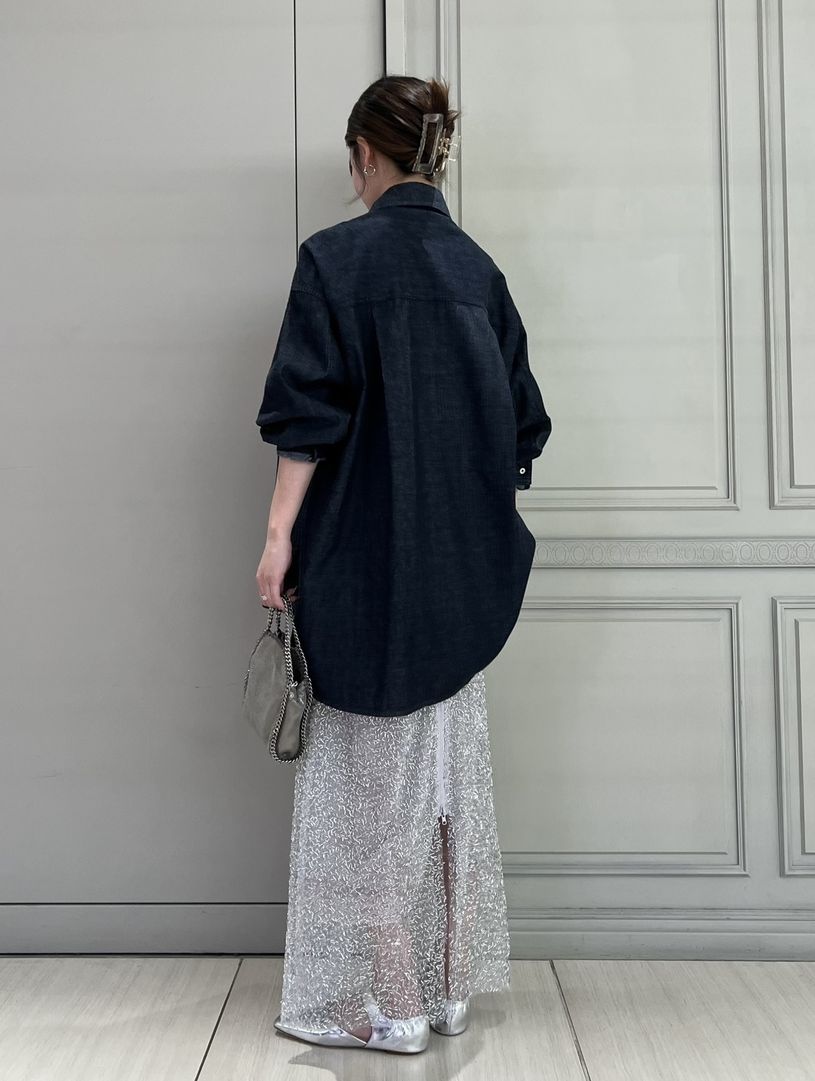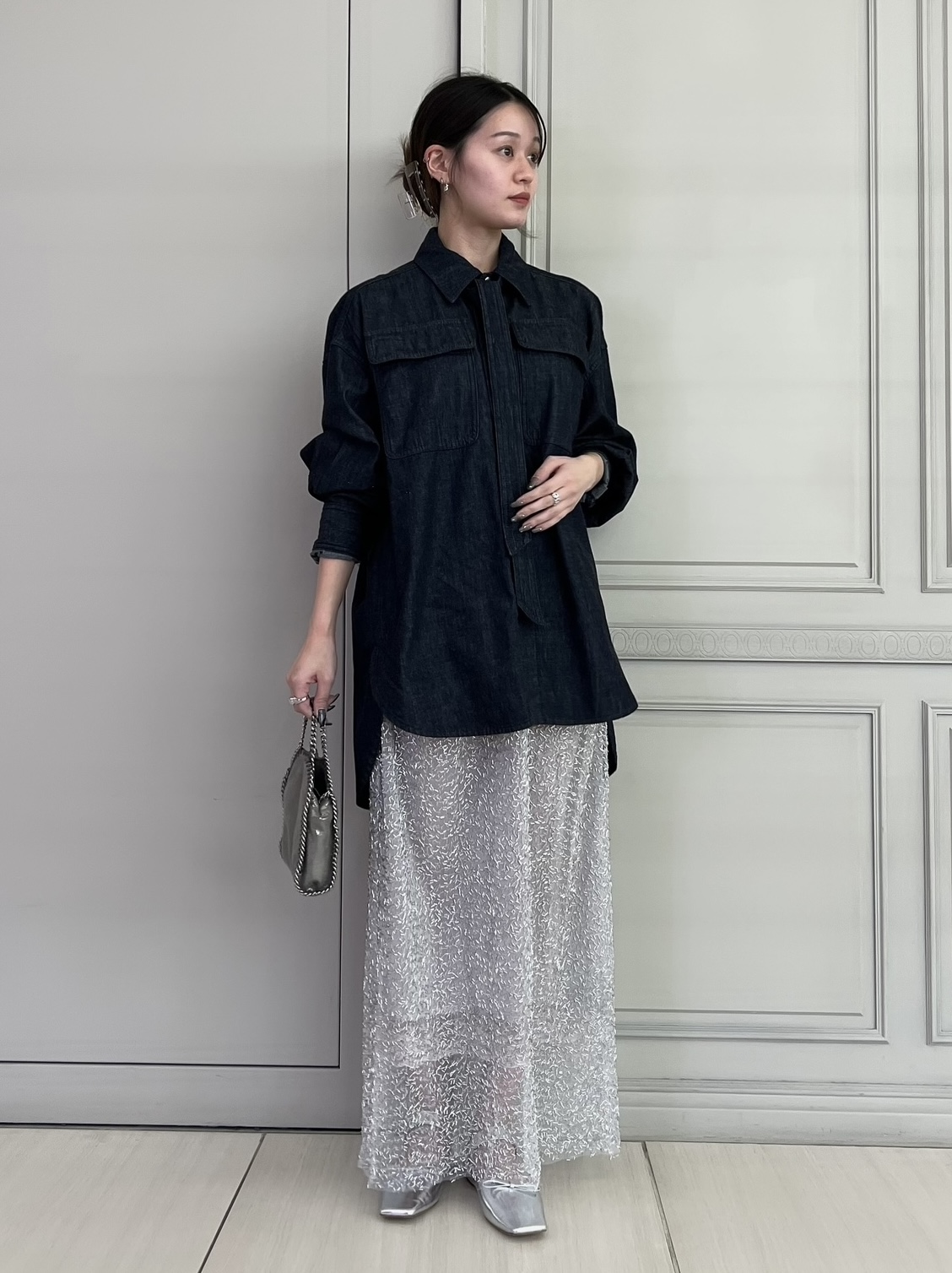 マットな質感のデニムに、繊細なスパンコールスカートを合わせた異素材ミックススタイル。小物もキラッと光るシルバーで統一すると、デニムの質感と深いブルーが際立ちます。