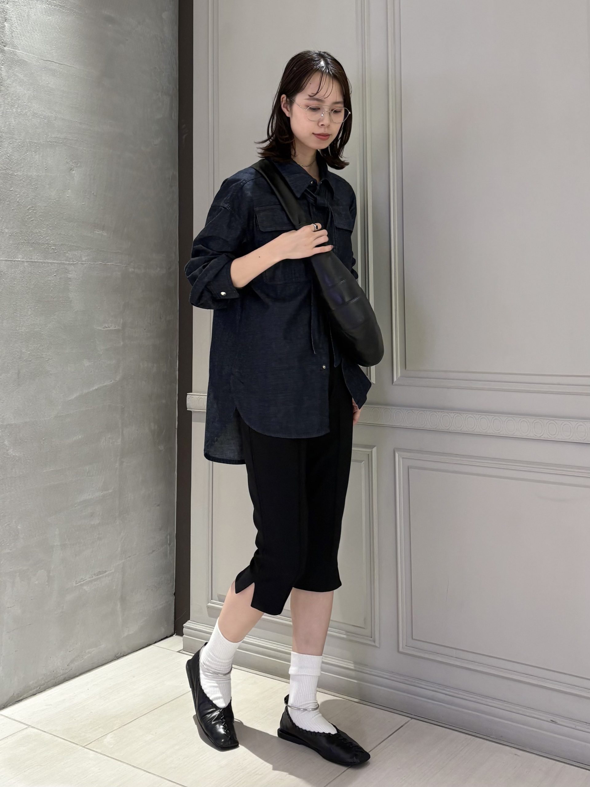 シャツはフロントを少し開けて抜けをつくり、ボトムはトレンドのカプリパンツを合わせて、シンプルながらも洗練された印象に仕上がっています。