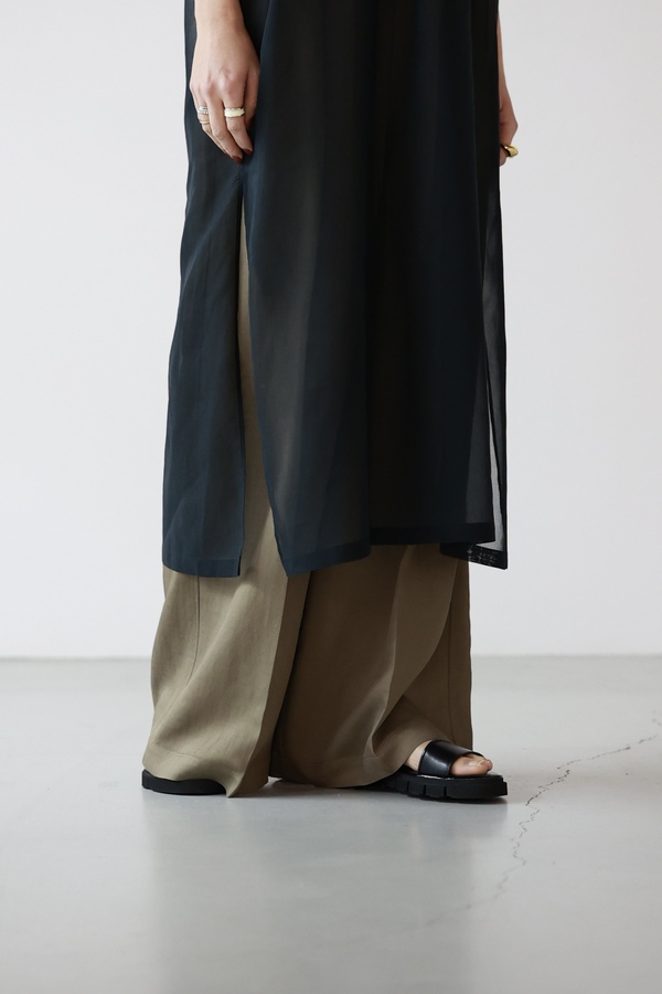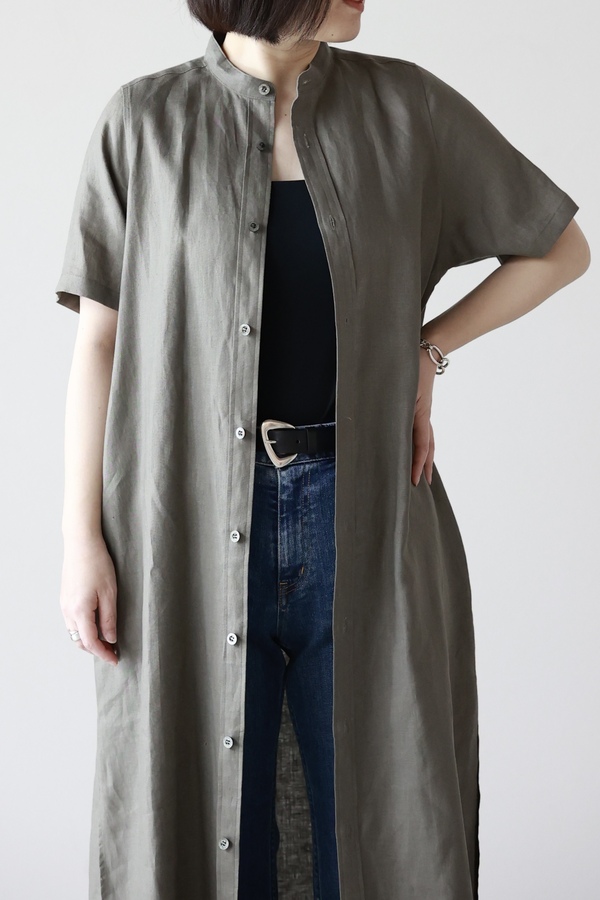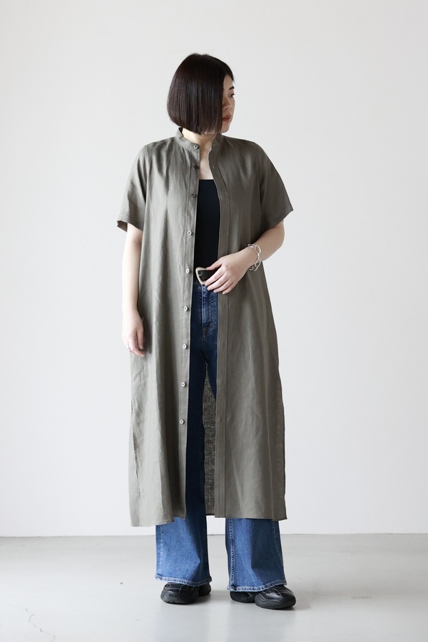 リネン素材ならではのドライな質感と縦長シルエットが特徴のシャツドレスは、羽織として取り入れることで一気に軽やかな印象に。