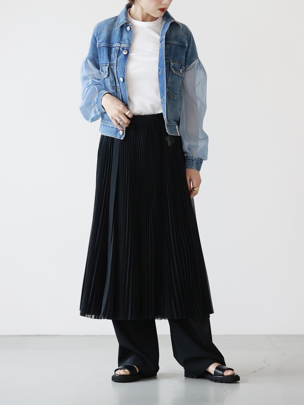 ボトムスはパンツ×スカートの組み合わせにすることで、動きと奥行きを演出し、スタイリング全体を一気にモードな印象へと引き上げます。