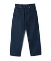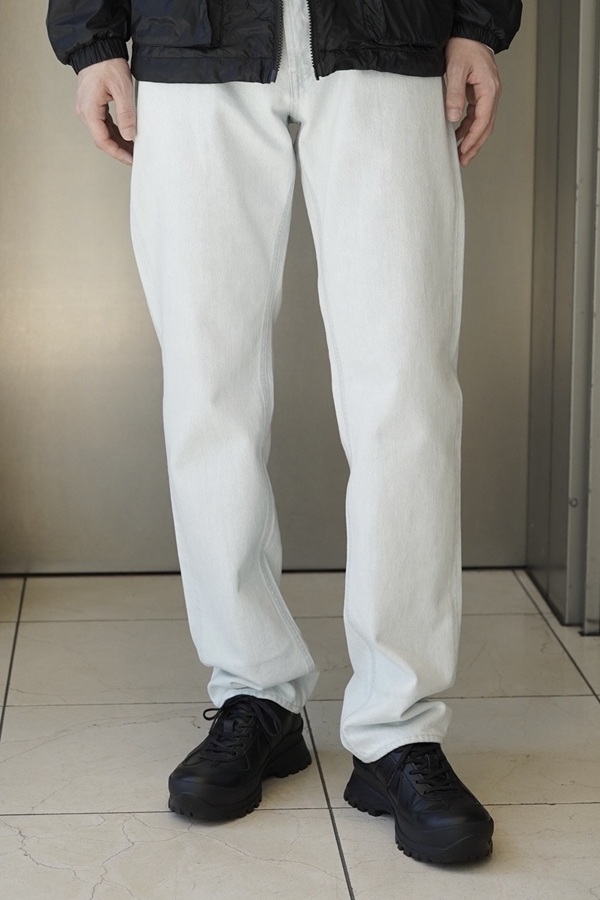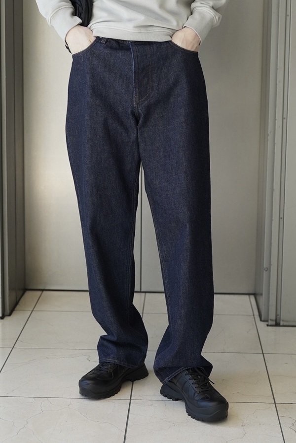 生地にはミッドウェイトのデニムが採用されており、重すぎず軽すぎない絶妙なバランスで、シーズンを問わず快適に着用できます。また、リンス加工を施すことで、デニム特有の硬さを軽減し、購入直後から柔らかく馴染みの良い履き心地を実現。自然な色味とクリーンな表情も特徴で、過度な加工感がない分、幅広いスタイリングに対応します。
