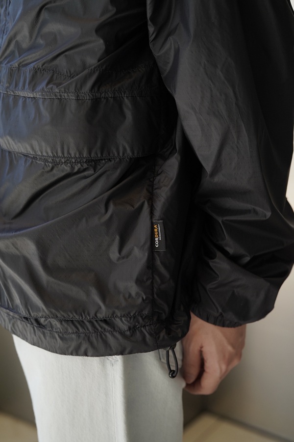 さらに、表面にはアンチドロップ(撥水)加工が施されており、軽い雨や水滴を弾く実用性も備えています。フード付きで、ジップ+スナップポケット、ラグランスリーブ、2WAYジップなど、動きやすさと機能性を意識したディテールも特徴です。