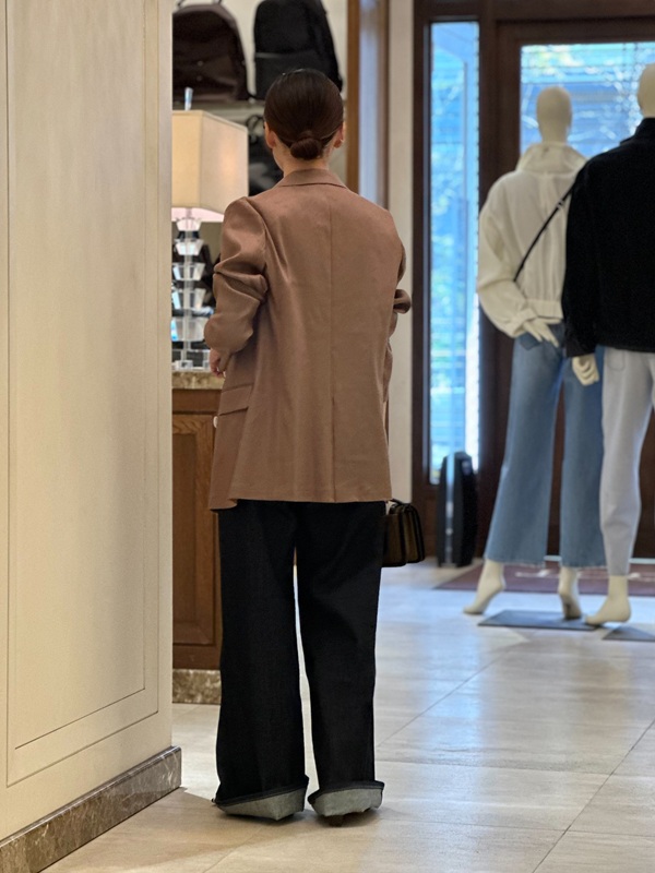 ブラウンジャケット×ダークインディゴデニムの落ち着いたスタイリング。