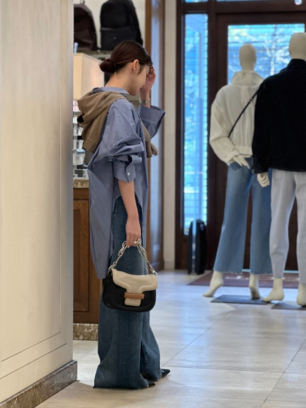 オーバーシャツに肩掛けを加えた、今っぽいレイヤードスタイル。