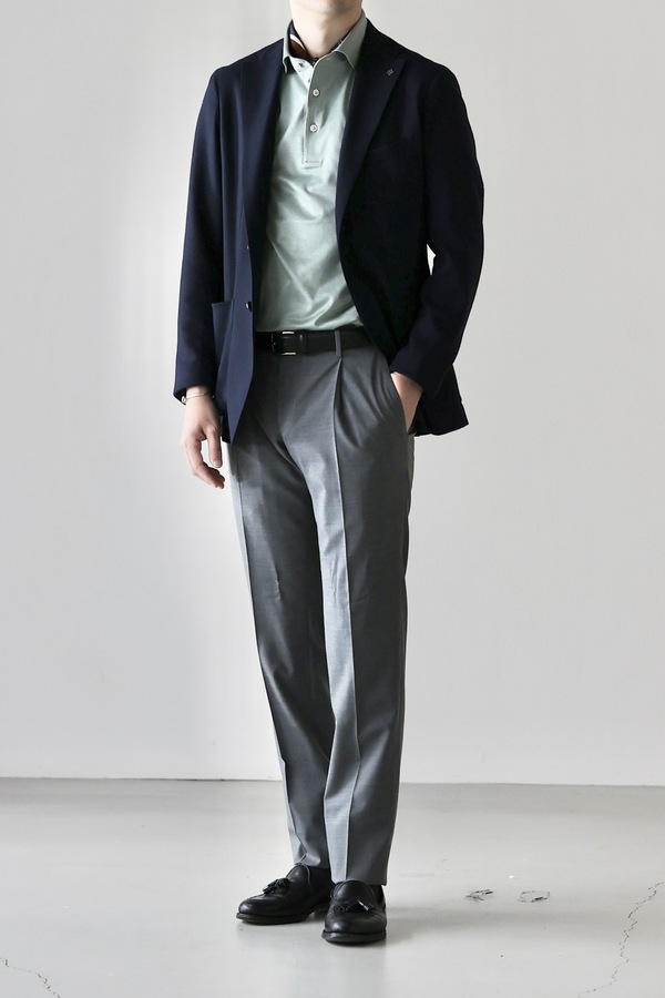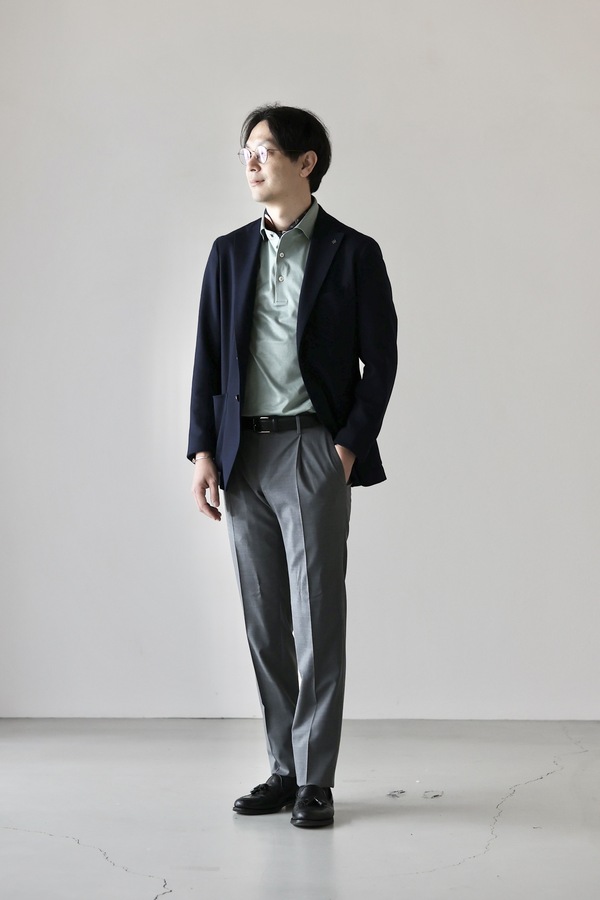 ネイビージャケットにポロシャツ、そしてグレースラックス。