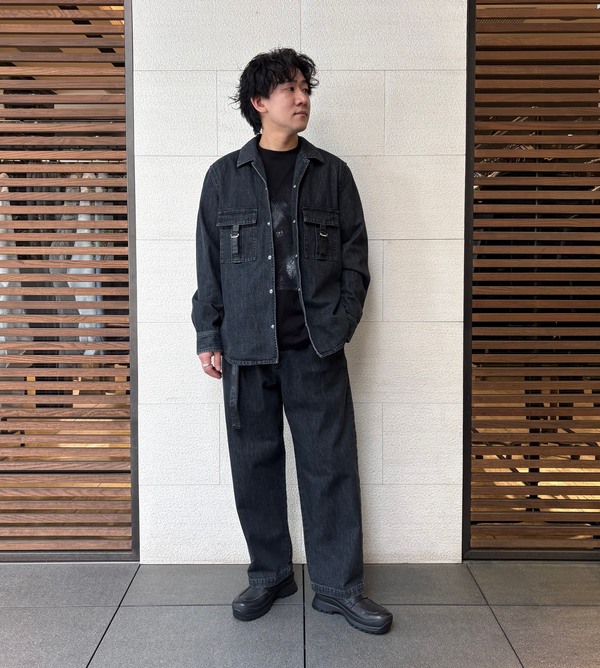 レザーを使っているので、足元もボリュームのあるローファーを合わせ、インナーに黒のデザインTシャツをいれてオールブラックに。