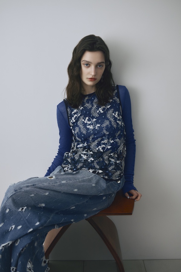 今季の別注アイテムは、「TULLE LACE SLEEVELESS SHIRT」を作成いただきました。今季のオケージョンシリーズで登場する花柄チュールレースを使用したノースリーブのブラウスです。