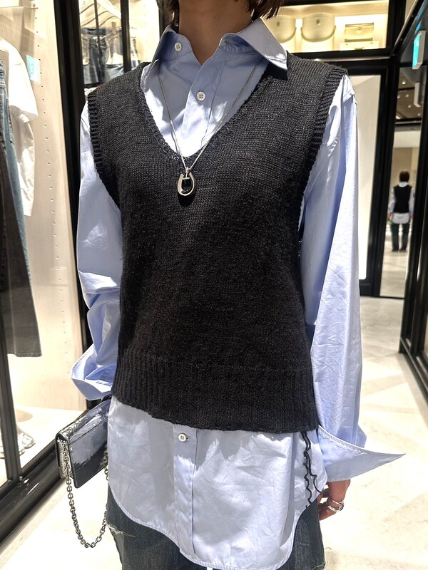 今時期なら、シャツとのレイヤードでこなれ感を出すのがおすすめです。