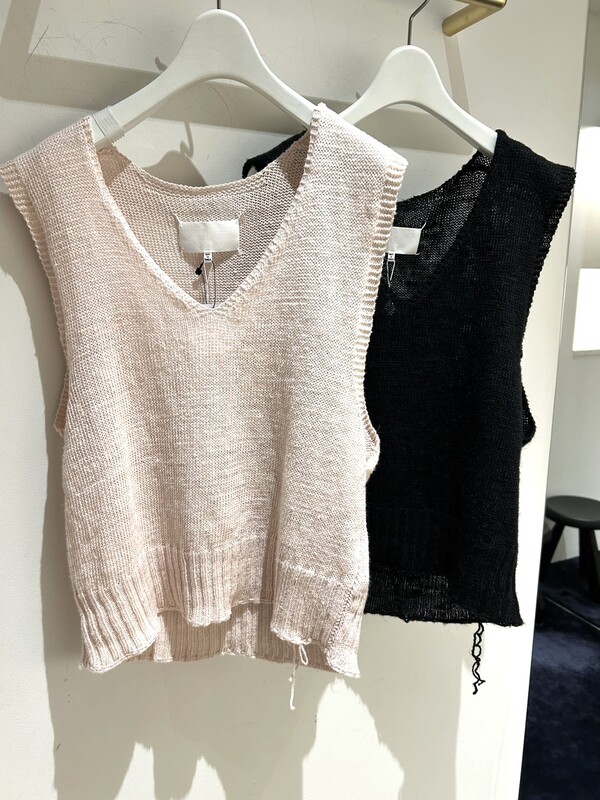 切りっぱなしのアームホールとVネックがシンプルながらもさりげないこだわり。