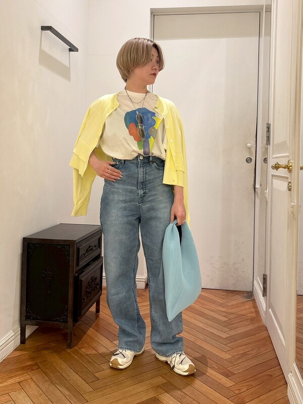 デニムの爽やかなライトブルーと相性の良いカラーアイテムを散りばめているのがポイントです。