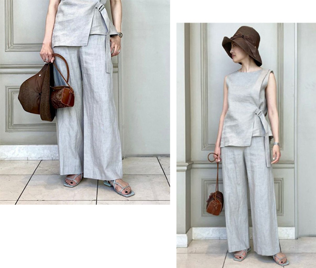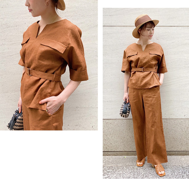 第6位は、先程3位にランクインしたパリゴの半袖ウエストベルトリネンブラウスとセットアップで着用いただけるリネンワイドパンツ。