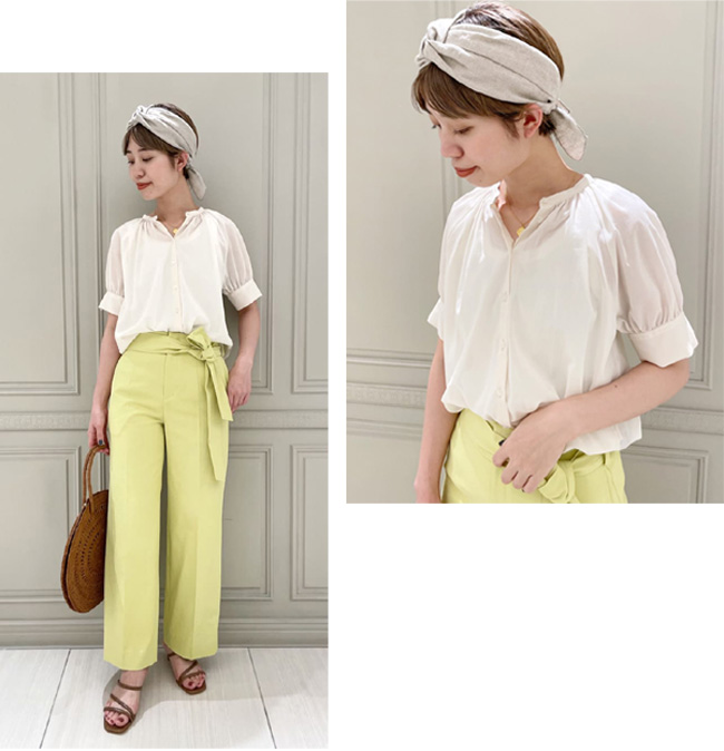 ギャザーやパフスリーブなど、甘めのデザインを盛り込みながらも、ボリュームを程よく押さえて大人のためのフェミニンブラウスに仕上げています。
