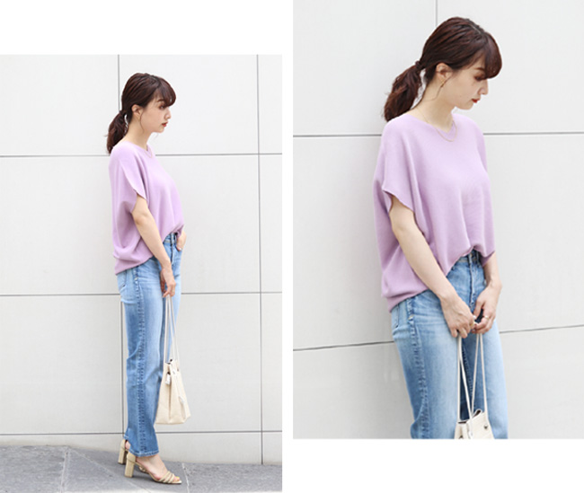絶妙な袖丈やゆとりのあるシルエットが、二の腕やお腹周りをカバーしてくれるのもポイント。