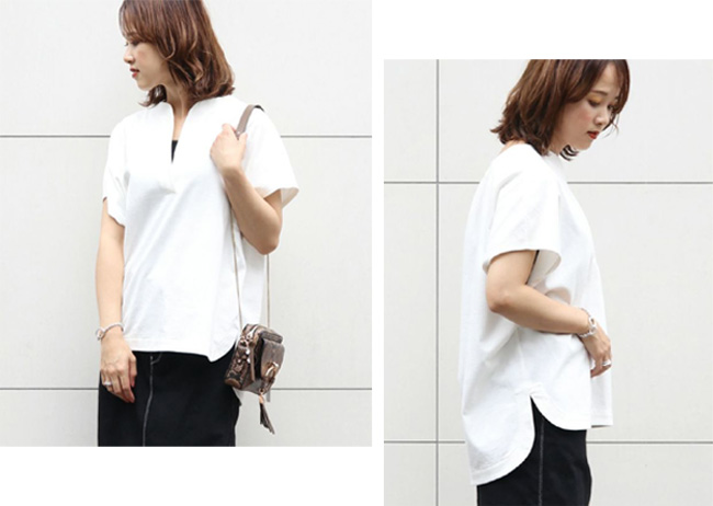 前後差のある着丈とサイドスリットのラウンド仕様などもポイントで、シンプルで終わらないデザインが魅力。