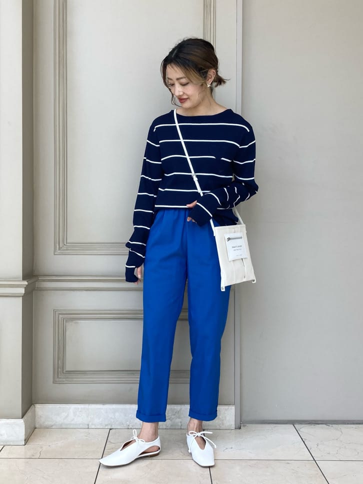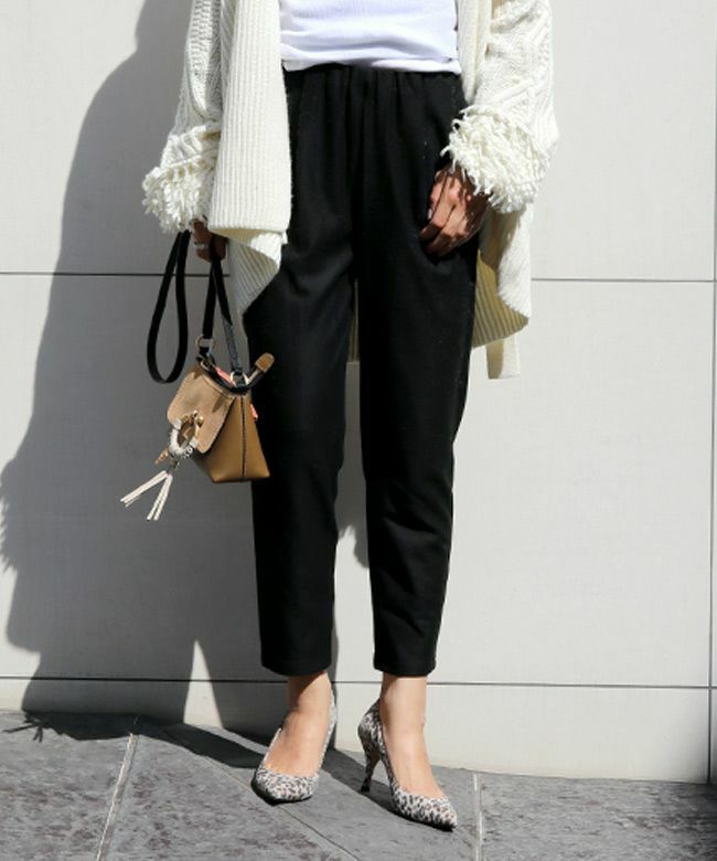 足首が見えるレングス丈なので、フラットシューズでもスッキリ美脚に見せてくれます。