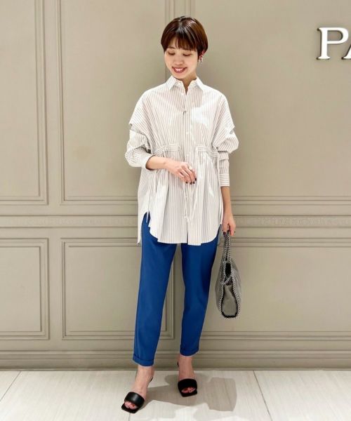 ウエストギャザーパンツに、華奢なストラップサンダルを合わせると美脚効果が更に高まるのでおすすめですよ。