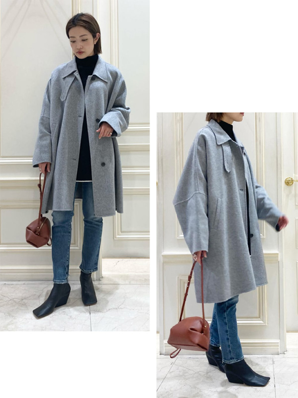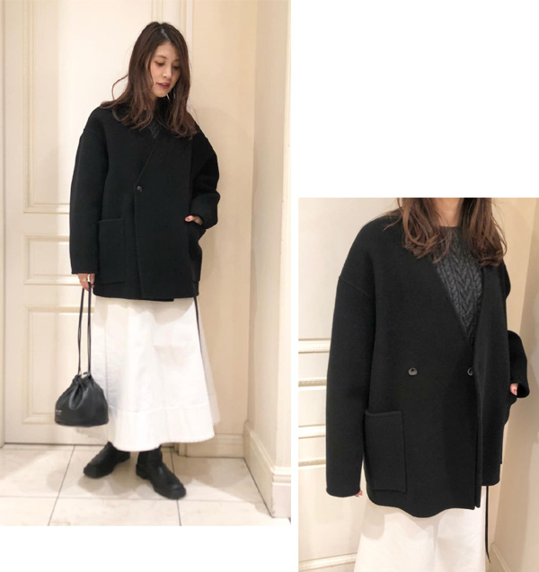 PARIGOT(パリゴ)のタスマニアウールショートコートを、尾道店のなっちゃんは大人フェミニンなモノトーンコーデに。