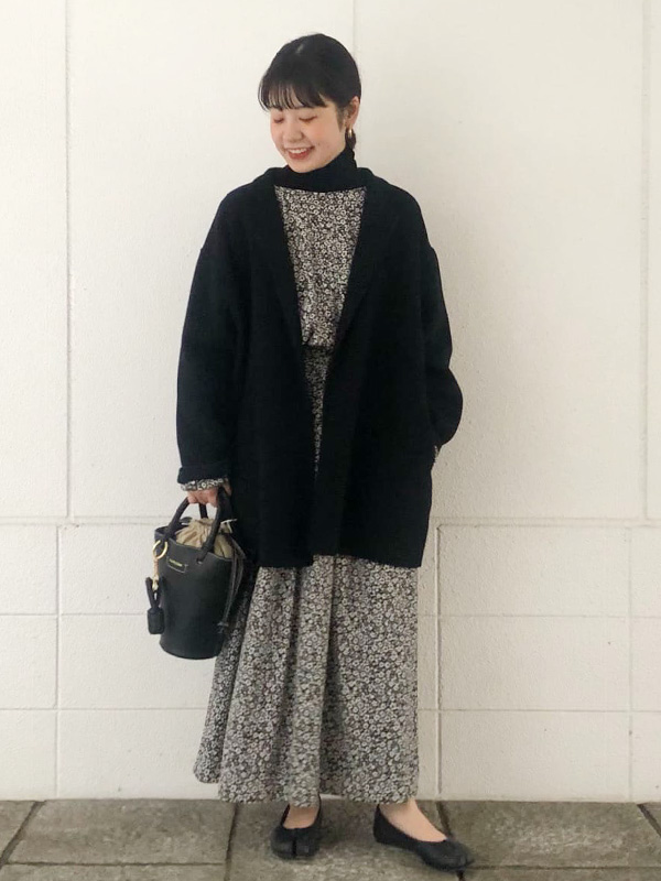 秋から着られるワンピース、冬も着こなすならなっちゃんのようにインナーにタートルニットをレイヤードして。