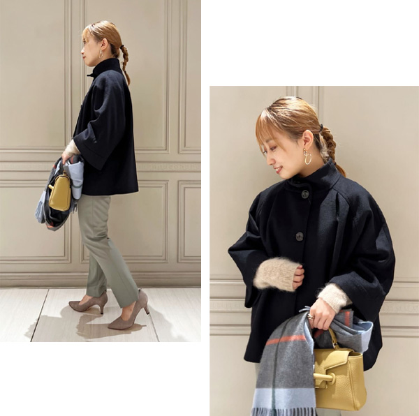 銀座店yuyuさんのショートアウターコーデ。バッグとストールのアクセントカラーも可愛いです!