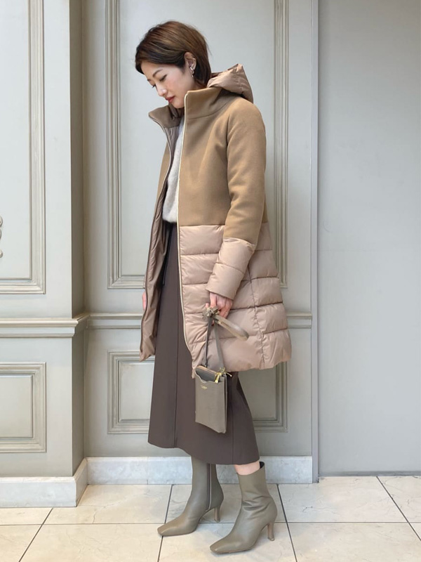ベージュ~モカ~ブラウンのグラデーションで上品なまとまりのあるダウンコーディネート。