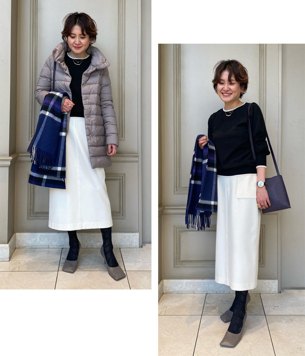 ホワイトのスカートでモノトーンにまとめ、グレージュとパープルの小物使いが流石の一言です…!