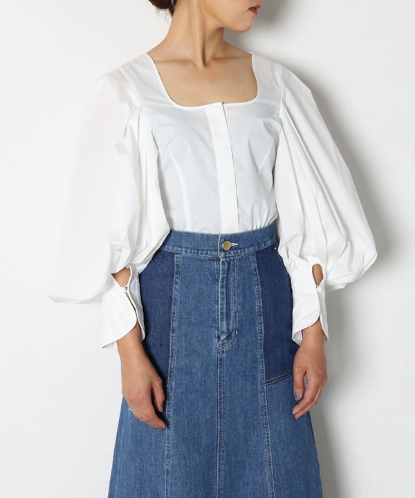 ネックラインに沿う様な緩やかなカーブパターンが印象的なボートネックドレス。袖のボリュームと背中に入れたタックが立体感を生み出し、女性らしい丸みのある美しいシルエットを作り出しています。フォーマルからタウンユースまで様々なシーンで活躍してくれる1着です。
