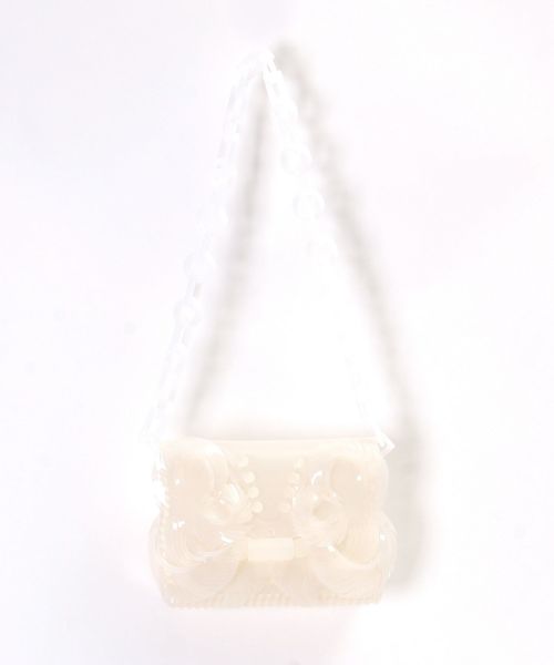ポリ塩化ビニールを使用したミニチェーンバッグ。多くは工業的に使われる素材の美しさに心惹かれ、デザイナー自身がカッターで切り、編み込み、モチーフを作ったのが始まり。職人の手作業によって作られるまさに工芸品のような美しいアイテムです。ガラスの様な繊細さを併せ持ち、陽の下でキラキラと輝く氷柱や氷をも連想させる逸品です。