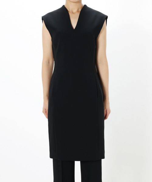 身体を立体的に見せるパターンが美しいスリーブレスVネックドレス。フロントのVネックラインは一枚でも上品に見せてくれ、インナーとの組み合わせによりデコルテに様々なニュアンスを与えられます。立体的なバックスタイルがどの角度からも体を美しく見せてくれます。パンツとのコーディネートもおすすめで。さまざまなシーンで活躍する1着です。