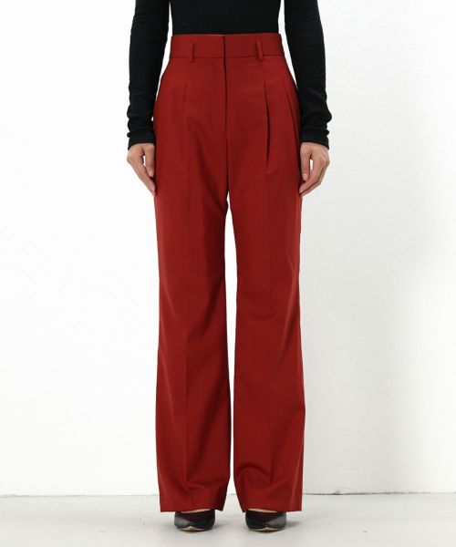 上質な素材と美しいシルエットが魅力のウールトラウザーズ。ややメンズライクな作りながら、ウエストにはタックを忍ばせ、裾に向かって上品に広がるシルエットです。センタープレスが縦のラインを強調し、足元をすっきりとみせてくれます。