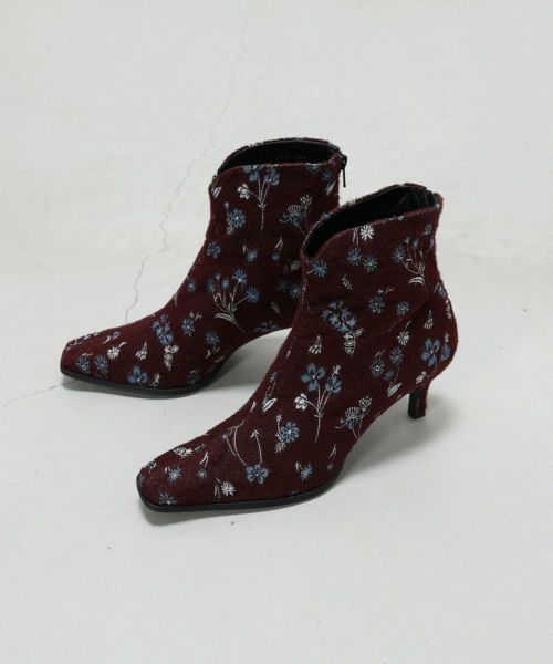 秋の夜闇に浮かぶ草花を描いたジャカードブーツ。起毛加工を施したジャカードにすることで柄に奥行きを出し、暗がりの中ぼんやりと見える景色を表現しています。どこかノスタルジーな雰囲気が漂うブーツはいつものスタイルに取り入れるだけで華やかさをプラスしてくれます。履き口のカーブを描くカッティングがセンシュアルな印象を与えます。