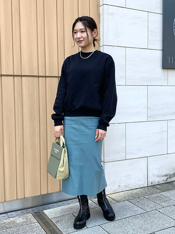 今季のトレンドカラーの一つである、ダスティーブルーのタイトスカートと合わせ、カジュアルの中にも女っぽさをプラスしてみました。