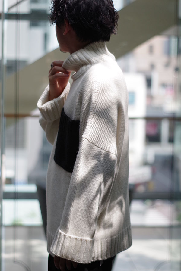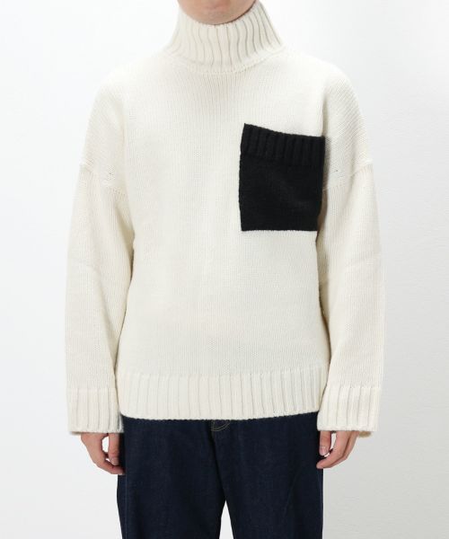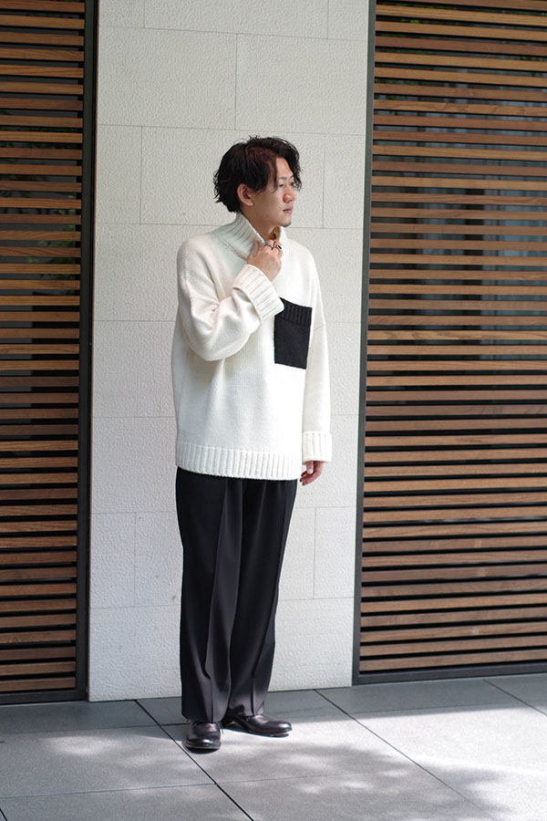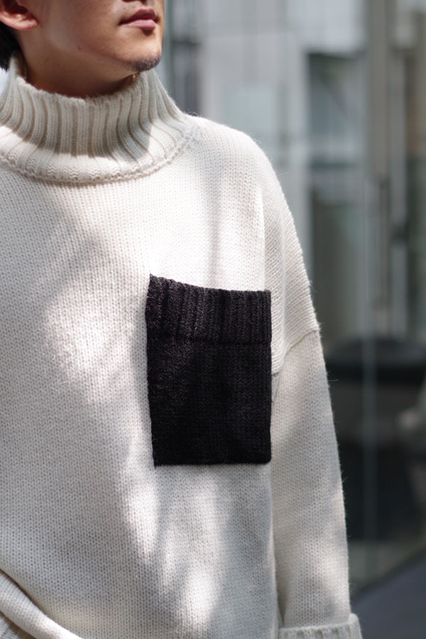 袖口が広くメンズにはない珍しいデザインですね。ドロップショルダーになっており、リラックス感を演出できるところと、ポケットを別の色のニットで縫い合わせてあるのでワンポイントになってくれますので一枚で様になります。