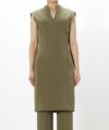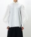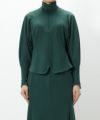 〇縄文中期の土器の紋様をカーブプリーツで表現したブラウス。袖をポイントにワンピースとレイヤードしミニマルなスタイリングに。