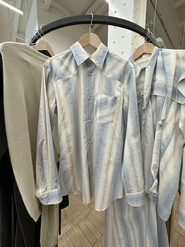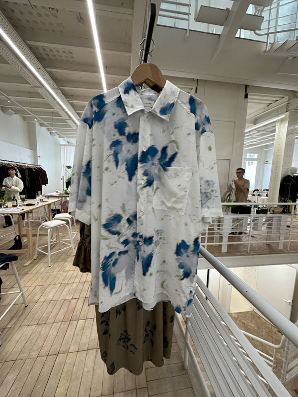 オリジナルテキスタイルのストライプ柄もパネル風に生地の取り方を変えているので動きのあるシャツに。