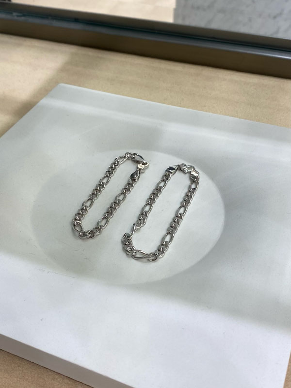 丸っとした長方形のデザインが新しいこちらのモデルは、他のシルバーアクセサリーとの重ね付けがおすすめです。