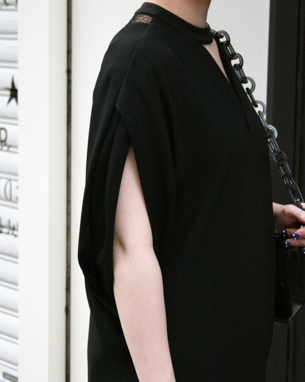 襟のカットラインや二の腕をカバーする袖のディテールが愛らしく美しいスタイルを作り出します。