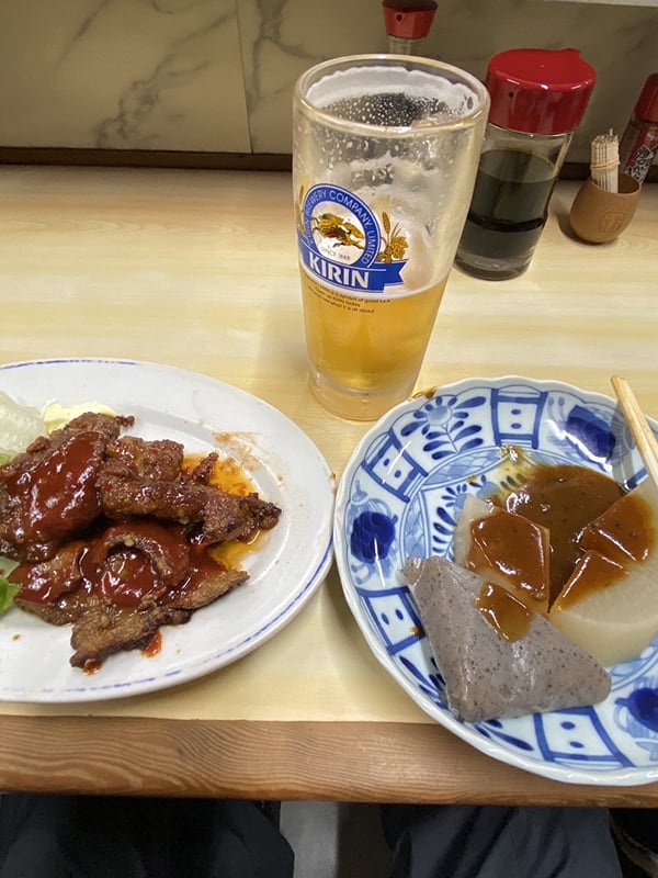 おでんは上に味噌が塗られており、この濃い味付けがビールのお供によく合います!