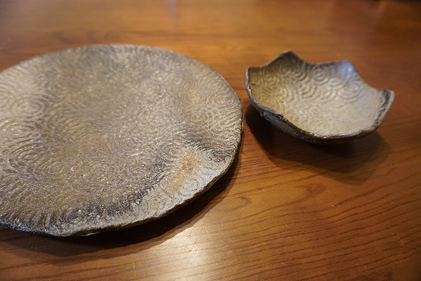 備前焼と須恵器の作家で有名な末廣学さんの作品がたまたま福山で見れるということで個展で購入した丸皿、小鉢皿。