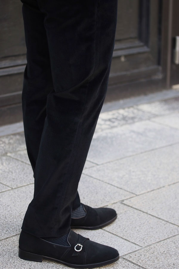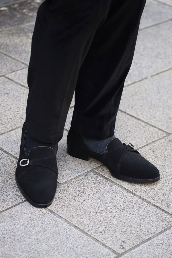 靴は表革だと存在感が強いので、全体のスタイリングの印象や合わせるアイテムの素材等を考慮し、柔和な黒スエードが好相性なのでおすすめです。