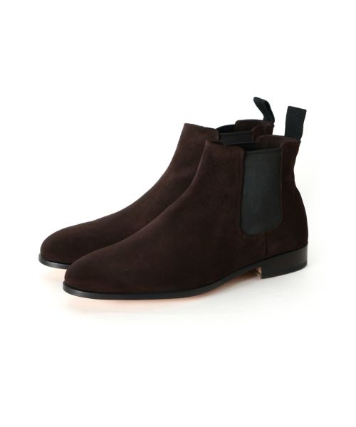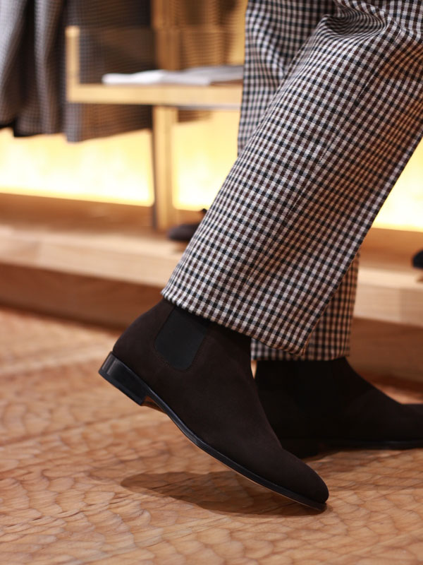 子供っぽくならないように、シューズはバックスキンのサイドゴアブーツで大人っぽく引き締めます。